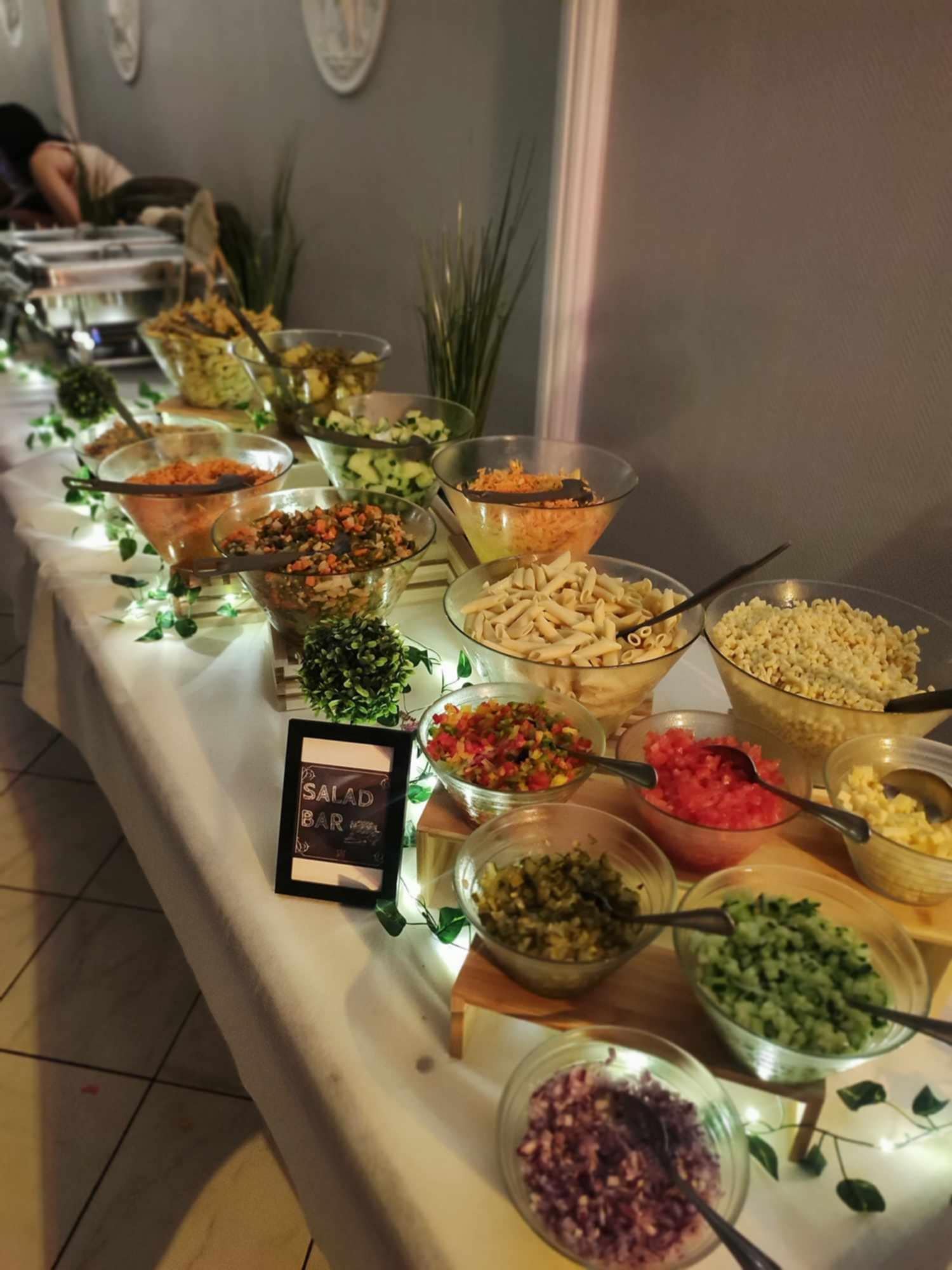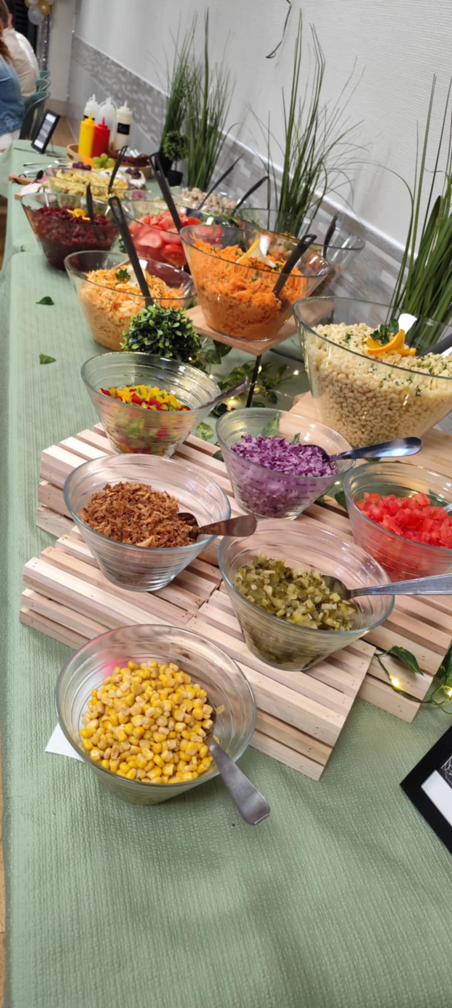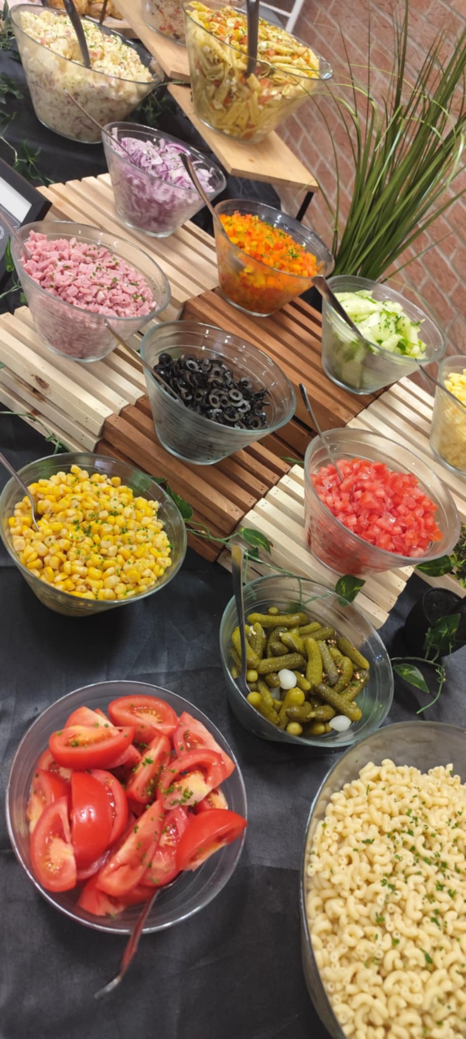 Pâte, Pomme de terre, Légumes (maïs, tomate, oignons rouge, poivron, …), Sauce, Vinaigrette, …